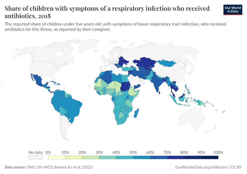 As you can see, in several countries in Eastern Europe and Central and South Asia, it’s common for children to receive antibiotics for respiratory infections. But it’s much less common in parts of Africa, where as few as one in four children receive them in some countries.