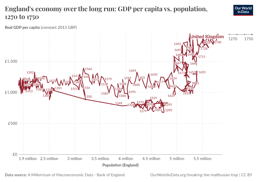 Max Roser (2020) - “Breaking out of the Malthusian trap: How pandemics allow us to understand why our ancestors were stuck in poverty” Published online at OurWorldinData.org. Retrieved from: 'https://wip-stagingserver-resources.owid.pages.dev:8789/20260304-094028/breaking-the-malthusian-trap.html' [Online Resource] (archived on March 4, 2026).BibTeX citation