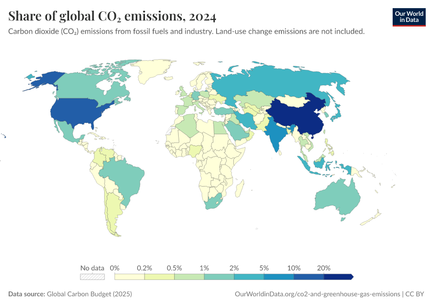 Annual CO2 emissions tell us how much each country emits in a given year. It shows us the geographical distribution of current emissions across the world.