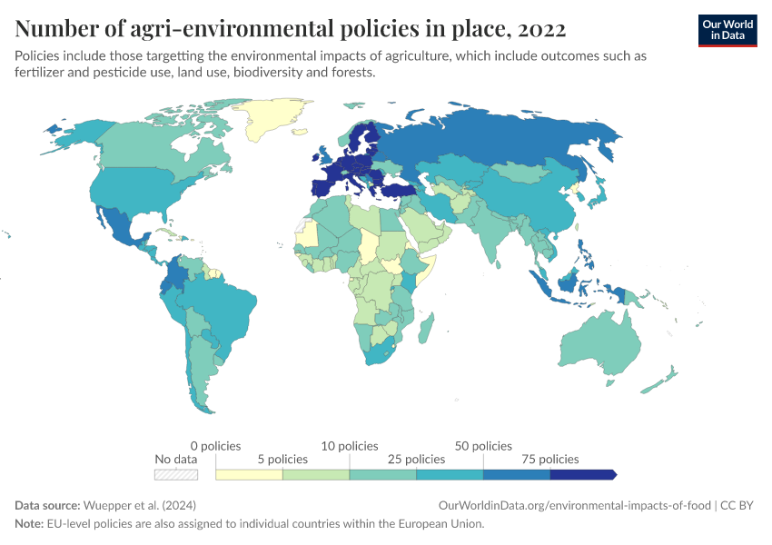 Hannah Ritchie (2024) - “How effective are policies in reducing the environmental impacts of agriculture?” Published online at OurWorldinData.org. Retrieved from: 'https://wip-stagingserver-resources.owid.pages.dev:8789/20260304-094028/effective-policies-reducing-environmental-impacts-agriculture.html' [Online Resource] (archived on March 4, 2026).BibTeX citation