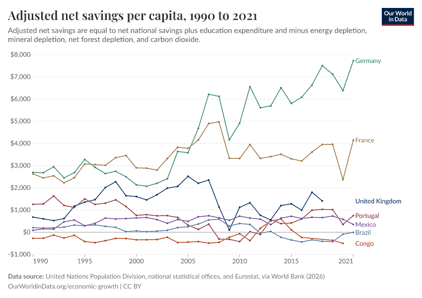 United Nations Population Division, national statistical offices, and Eurostat, via World Bank (2026) – processed by Our World in Data. “Adjusted net savings per capita” [dataset]. United Nations Population Division, national statistical offices, and Eurostat, via World Bank, “World Development Indicators 125” [original data]. Retrieved March 12, 2026 from https://wip-stagingserver-resources.owid.pages.dev:8789/20260304-094028/grapher/adjusted-net-savings-per-person.html (archived on March 4, 2026).