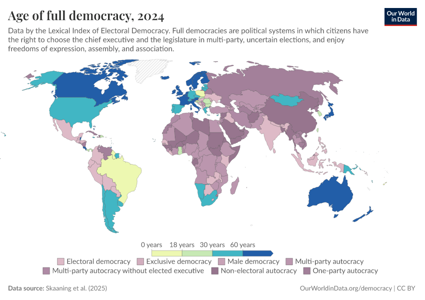 Skaaning et al. (2025) – processed by Our World in Data. “Age of full democracy” [dataset]. Skaaning et al., “Lexical Index of Electoral Democracy (LIED) v6.8” [original data]. Retrieved March 12, 2026 from https://wip-stagingserver-resources.owid.pages.dev:8789/20260304-094028/grapher/age-of-full-democracy.html (archived on March 4, 2026).