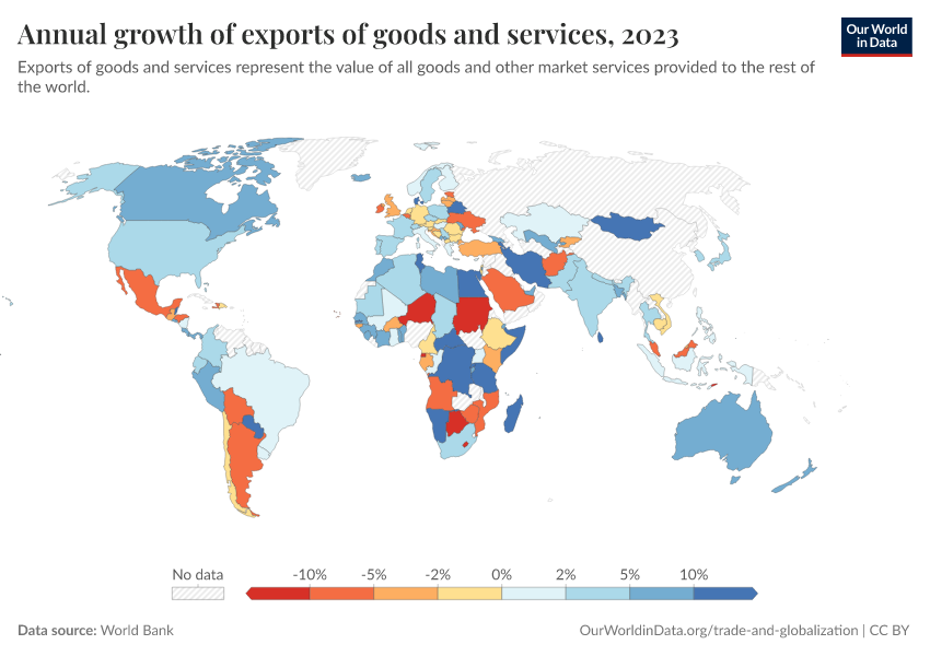 “Data Page: Annual growth of exports of goods and services”. Our World in Data (2026). Data adapted from World Bank. Retrieved from https://wip-stagingserver-resources.owid.pages.dev:8789/20260304-094028/grapher/annual-growth-of-exports-of-goods-and-services.html [online resource] (archived on March 4, 2026).How to cite this data