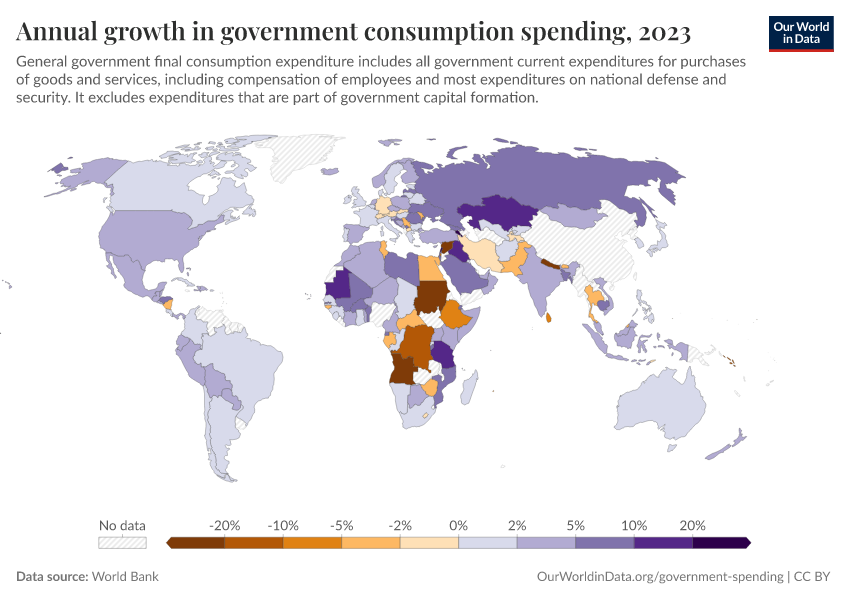 “Data Page: Annual growth in government consumption spending”. Our World in Data (2026). Data adapted from World Bank. Retrieved from https://wip-stagingserver-resources.owid.pages.dev:8789/20260304-094028/grapher/annual-growth-of-general-government-final-consumption-expenditure.html [online resource] (archived on March 4, 2026).How to cite this data