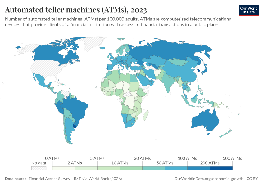 “Data Page: Automated teller machines (ATMs)”. Our World in Data (2026). Data adapted from Financial Access Survey - IMF, via World Bank. Retrieved from https://wip-stagingserver-resources.owid.pages.dev:8789/20260304-094028/grapher/automated-teller-machines-atms-per-100000-adults.html [online resource] (archived on March 4, 2026).How to cite this data