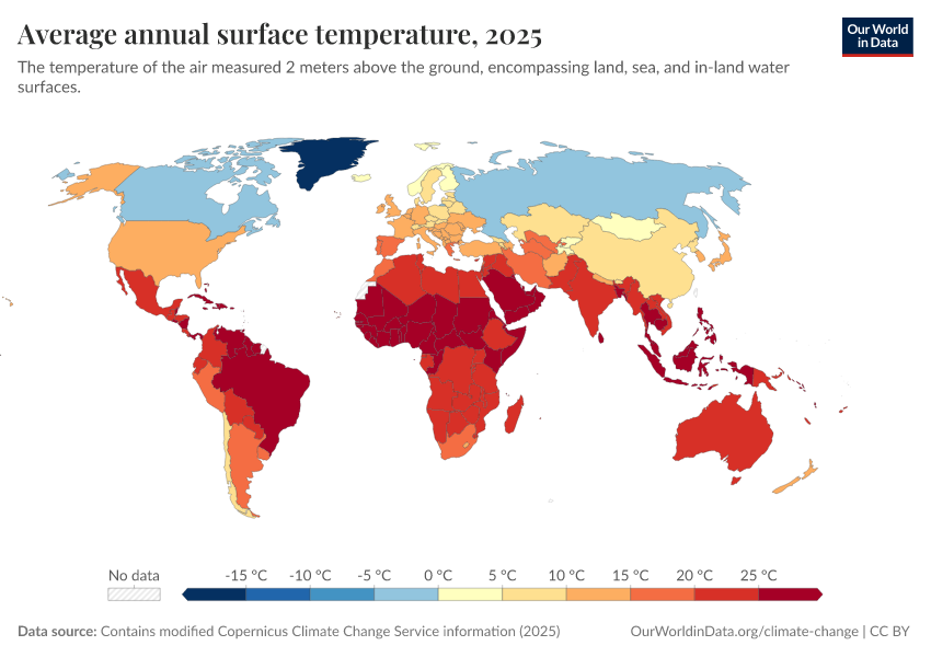 Contains modified Copernicus Climate Change Service information (2025) – with major processing by Our World in Data. “Average annual surface temperature” [dataset]. Contains modified Copernicus Climate Change Service information, “ERA5 monthly averaged data on single levels from 1940 to present 2” [original data]. Retrieved March 12, 2026 from https://wip-stagingserver-resources.owid.pages.dev:8789/20260304-094028/grapher/average-annual-surface-temperature.html (archived on March 4, 2026).