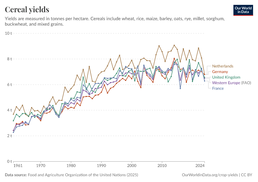 Food and Agriculture Organization of the United Nations (2025) – with major processing by Our World in Data. “Cereal yields – UN FAO” [dataset]. Food and Agriculture Organization of the United Nations, “Production: Crops and livestock products” [original data]. Retrieved March 12, 2026 from https://wip-stagingserver-resources.owid.pages.dev:8789/20260304-094028/grapher/cereal-yield.html (archived on March 4, 2026).