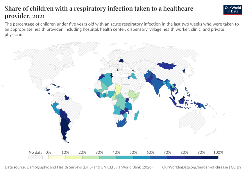 Demographic and Health Surveys (DHS) and UNICEF, via World Bank (2026) – processed by Our World in Data. “Share of children with a respiratory infection taken to a healthcare provider ” [dataset]. Demographic and Health Surveys (DHS) and UNICEF, via World Bank, “World Development Indicators 125” [original data]. Retrieved March 12, 2026 from https://wip-stagingserver-resources.owid.pages.dev:8789/20260304-094028/grapher/children-treated-ari.html (archived on March 4, 2026).