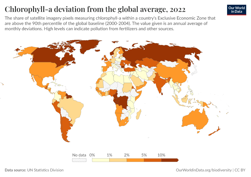 “Data Page: Chlorophyll-a deviation from the global average”. Our World in Data (2026). Data adapted from UN Statistics Division. Retrieved from https://wip-stagingserver-resources.owid.pages.dev:8789/20260304-094028/grapher/chlorophyll-a-deviation-from-the-global-average.html [online resource] (archived on March 4, 2026).How to cite this data