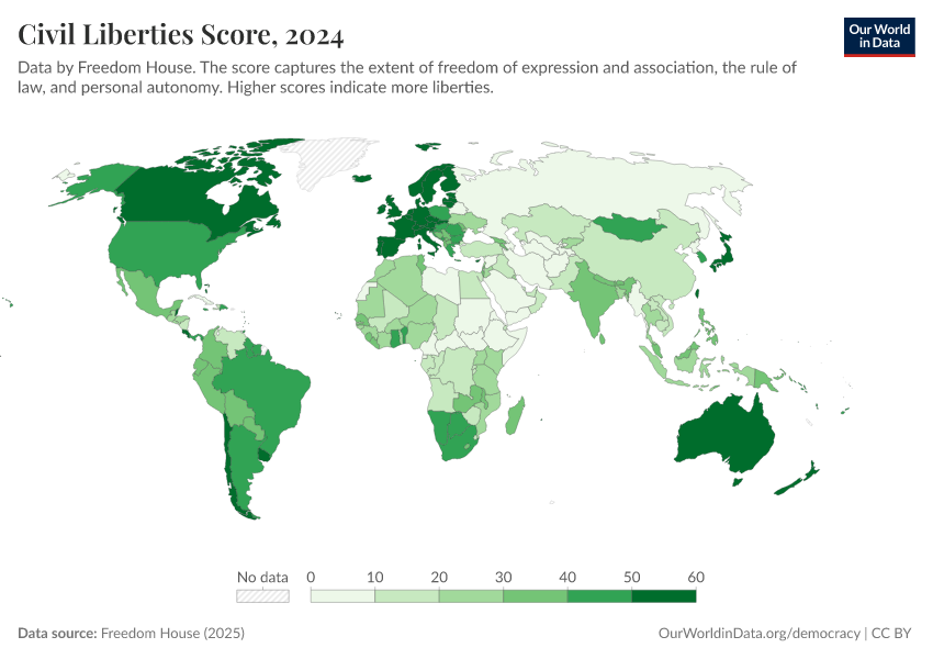 Freedom House (2025) – processed by Our World in Data. “Civil Liberties Score” [dataset]. Freedom House, “Freedom in the World” [original data]. Retrieved March 12, 2026 from https://wip-stagingserver-resources.owid.pages.dev:8789/20260304-094028/grapher/civil-liberties-score-fh.html (archived on March 4, 2026).