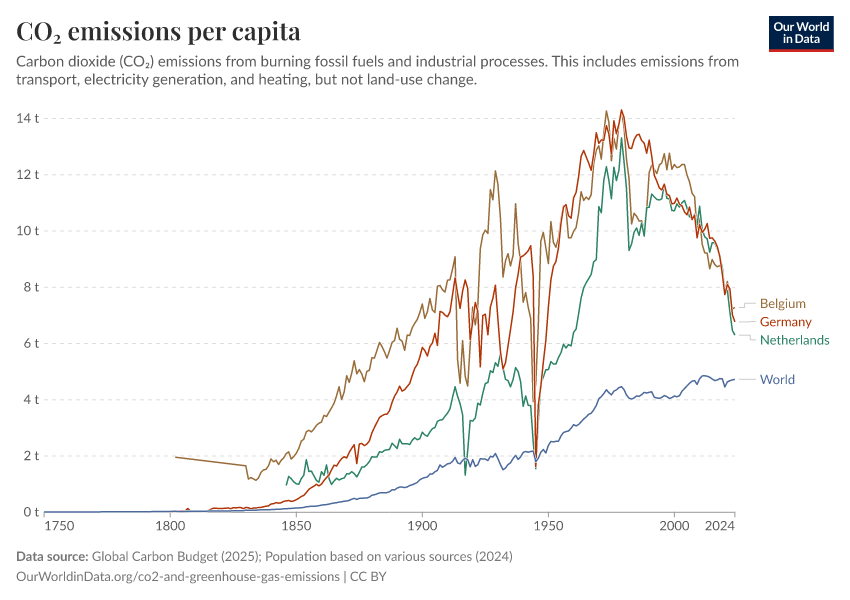 “Data Page: CO₂ emissions per capita”, part of the following publication: Hannah Ritchie, Pablo Rosado, and Max Roser (2023) - “CO₂ and Greenhouse Gas Emissions”. Data adapted from Global Carbon Project, Various sources. Retrieved from https://wip-stagingserver-resources.owid.pages.dev:8789/20260304-094028/grapher/co-emissions-per-capita.html [online resource] (archived on March 4, 2026).