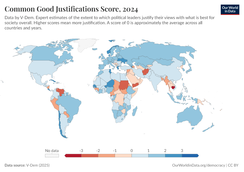 “Data Page: Common good justifications”, part of the following publication: Bastian Herre, Lucas Rodés-Guirao, and Esteban Ortiz-Ospina (2013) - “Democracy”. Data adapted from V-Dem. Retrieved from https://wip-stagingserver-resources.owid.pages.dev:8789/20260304-094028/grapher/common-good-justifications-score.html [online resource] (archived on March 4, 2026).How to cite this data