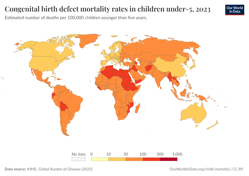 IHME, Global Burden of Disease (2025) – with major processing by Our World in Data. “Congenital birth defect mortality rates in children under-5” [dataset]. IHME, Global Burden of Disease, “Global Burden of Disease - Deaths” [original data]. Retrieved March 12, 2026 from https://wip-stagingserver-resources.owid.pages.dev:8789/20260304-094028/grapher/congenital-birth-defect-mortality-rates-in-children-under-5.html (archived on March 4, 2026).