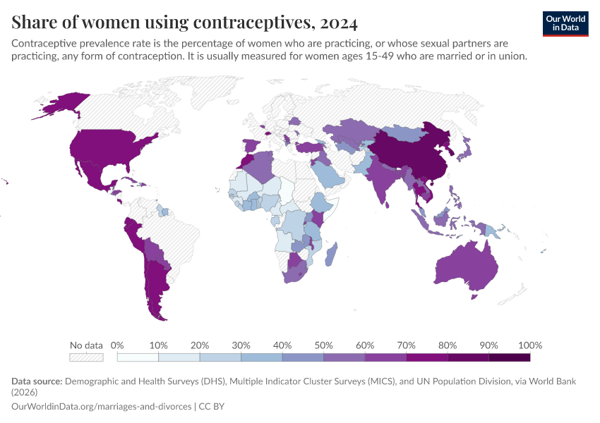 “Data Page: Share of women using contraceptives”. Our World in Data (2026). Data adapted from Demographic and Health Surveys (DHS), Multiple Indicator Cluster Surveys (MICS), and UN Population Division, via World Bank. Retrieved from https://wip-stagingserver-resources.owid.pages.dev:8789/20260304-094028/grapher/contraceptive-prevalence-any-methods-of-women-ages-15-49.html [online resource] (archived on March 4, 2026).How to cite this data
