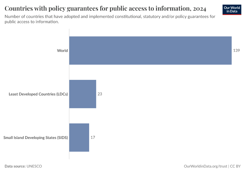 “Data Page: Countries with policy guarantees for public access to information”. Our World in Data (2026). Data adapted from UNESCO. Retrieved from https://wip-stagingserver-resources.owid.pages.dev:8789/20260304-094028/grapher/countries-that-adopt-guarantees-for-public-access-to-information.html [online resource] (archived on March 4, 2026).How to cite this data