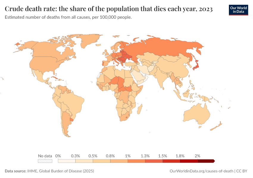 IHME, Global Burden of Disease (2025) – with major processing by Our World in Data. “Crude death rate: the share of the population that dies each year” [dataset]. IHME, Global Burden of Disease, “Global Burden of Disease - Deaths” [original data]. Retrieved March 12, 2026 from https://wip-stagingserver-resources.owid.pages.dev:8789/20260304-094028/grapher/crude-death-rate-the-share-of-the-population-that-dies-each-year-gbd.html (archived on March 4, 2026).