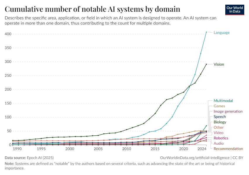 Epoch AI (2025) – with major processing by Our World in Data. “Cumulative number of notable AI systems by domain” [dataset]. Epoch AI, “Parameter, Compute and Data Trends in Machine Learning” [original data]. Retrieved March 12, 2026 from https://wip-stagingserver-resources.owid.pages.dev:8789/20260304-094028/grapher/cumulative-number-of-notable-ai-systems-by-domain.html (archived on March 4, 2026).