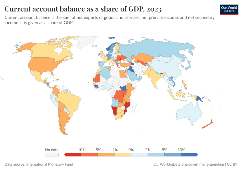 International Monetary Fund – processed by Our World in Data. “Current account balance as a share of GDP” [dataset]. International Monetary Fund, “International Monetary Fund, Balance of Payments Statistics Yearbook and data files, and World Bank and OECD GDP estimates.” [original data]. Retrieved March 12, 2026 from https://wip-stagingserver-resources.owid.pages.dev:8789/20260304-094028/grapher/current-account-balance-as-a-proportion-of-gdp.html (archived on March 4, 2026).
