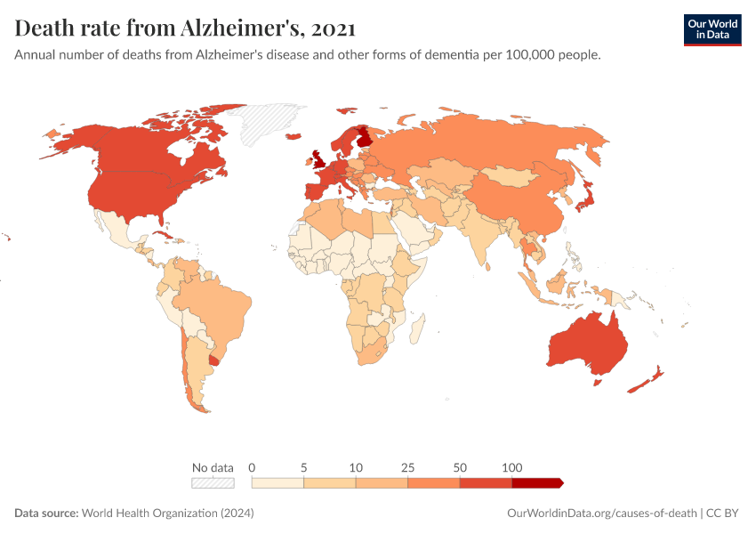 World Health Organization (2024) – with major processing by Our World in Data. “Death rate from Alzheimer's” [dataset]. World Health Organization, “Global Health Estimates” [original data]. Retrieved March 12, 2026 from https://wip-stagingserver-resources.owid.pages.dev:8789/20260304-094028/grapher/death-rate-from-alzheimers-other-dementias-ghe.html (archived on March 4, 2026).