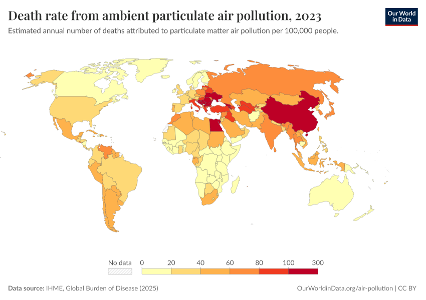 IHME, Global Burden of Disease (2025) – with major processing by Our World in Data. “Death rate from ambient particulate air pollution” [dataset]. IHME, Global Burden of Disease, “Global Burden of Disease - Risk Factors - Deaths” [original data]. Retrieved March 12, 2026 from https://wip-stagingserver-resources.owid.pages.dev:8789/20260304-094028/grapher/death-rate-from-ambient-particulate-air-pollution.html (archived on March 4, 2026).