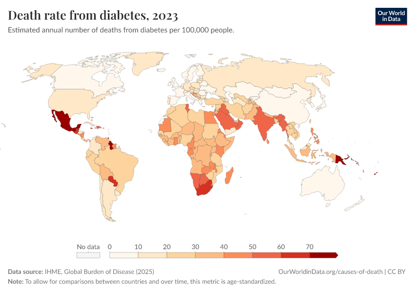IHME, Global Burden of Disease (2025) – with major processing by Our World in Data. “Death rate from diabetes” [dataset]. IHME, Global Burden of Disease, “Global Burden of Disease - Deaths” [original data]. Retrieved March 12, 2026 from https://wip-stagingserver-resources.owid.pages.dev:8789/20260304-094028/grapher/death-rate-from-diabetes.html (archived on March 4, 2026).