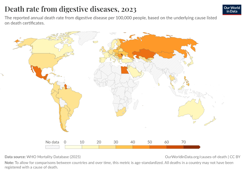 “Data Page: Death rate from digestive diseases”, part of the following publication: Saloni Dattani, Fiona Spooner, Hannah Ritchie, and Max Roser (2023) - “Causes of Death”. Data adapted from WHO Mortality Database. Retrieved from https://wip-stagingserver-resources.owid.pages.dev:8789/20260304-094028/grapher/death-rate-from-digestive-diseases-who-mdb.html [online resource] (archived on March 4, 2026).How to cite this data