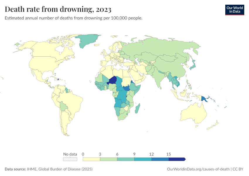 IHME, Global Burden of Disease (2025) – with major processing by Our World in Data. “Death rate from drowning” [dataset]. IHME, Global Burden of Disease, “Global Burden of Disease - Deaths” [original data]. Retrieved March 12, 2026 from https://wip-stagingserver-resources.owid.pages.dev:8789/20260304-094028/grapher/death-rate-from-drowning.html (archived on March 4, 2026).