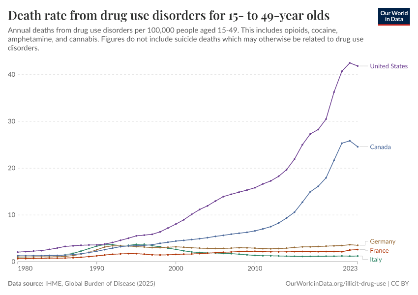 IHME, Global Burden of Disease (2025) – with major processing by Our World in Data. “Death rate from drug use disorders for 15- to 49-year olds” [dataset]. IHME, Global Burden of Disease, “Global Burden of Disease - Deaths” [original data]. Retrieved March 12, 2026 from https://wip-stagingserver-resources.owid.pages.dev:8789/20260304-094028/grapher/death-rate-from-drug-use-disorders-for-15--to-49-year-olds.html (archived on March 4, 2026).