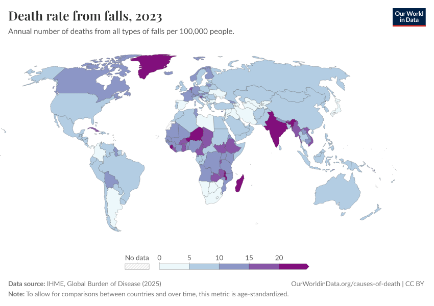 IHME, Global Burden of Disease (2025) – with major processing by Our World in Data. “Death rate from falls” [dataset]. IHME, Global Burden of Disease, “Global Burden of Disease - Deaths” [original data]. Retrieved March 12, 2026 from https://wip-stagingserver-resources.owid.pages.dev:8789/20260304-094028/grapher/death-rate-from-falls-gbd.html (archived on March 4, 2026).