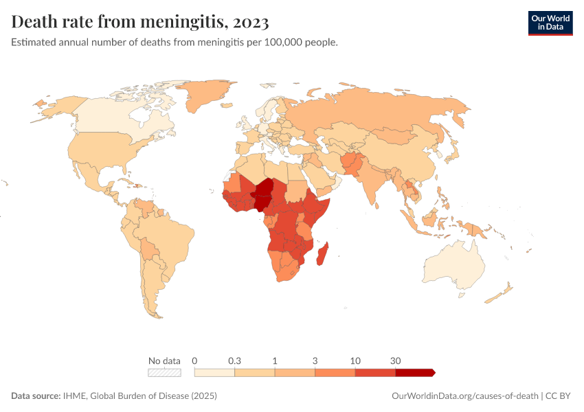 “Data Page: Death rate from meningitis”, part of the following publication: Esteban Ortiz-Ospina and Max Roser (2016) - “Global Health”. Data adapted from IHME, Global Burden of Disease. Retrieved from https://wip-stagingserver-resources.owid.pages.dev:8789/20260304-094028/grapher/death-rate-from-meningitis-gbd.html [online resource] (archived on March 4, 2026).How to cite this data