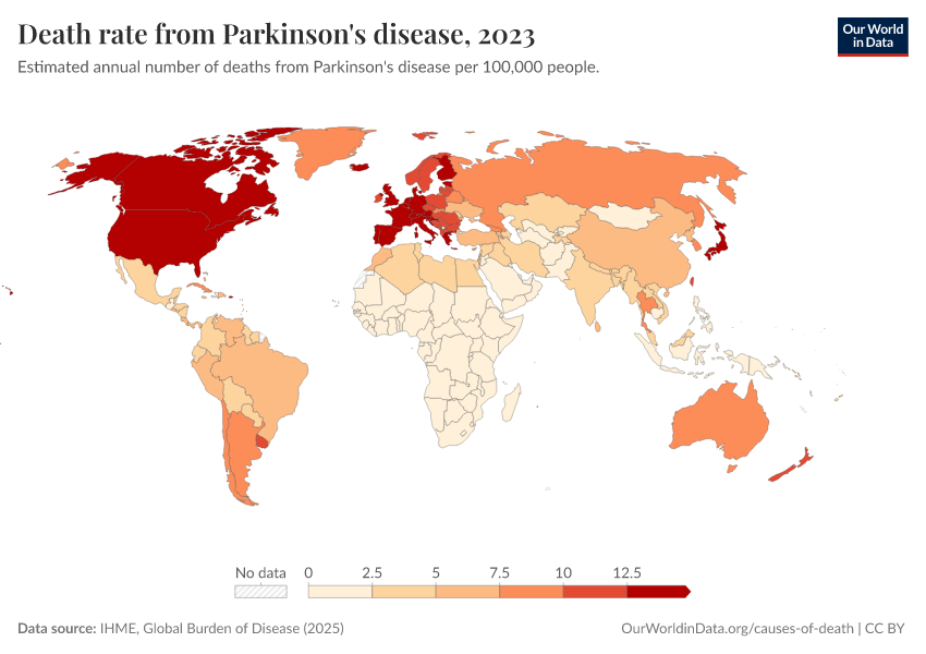 IHME, Global Burden of Disease (2025) – with major processing by Our World in Data. “Death rate from Parkinson's disease” [dataset]. IHME, Global Burden of Disease, “Global Burden of Disease - Deaths” [original data]. Retrieved March 12, 2026 from https://wip-stagingserver-resources.owid.pages.dev:8789/20260304-094028/grapher/death-rate-from-parkinsons-disease-gbd.html (archived on March 4, 2026).