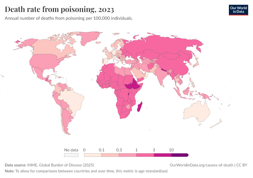 IHME, Global Burden of Disease (2025) – with major processing by Our World in Data. “Death rate from poisoning” [dataset]. IHME, Global Burden of Disease, “Global Burden of Disease - Deaths” [original data]. Retrieved March 12, 2026 from https://wip-stagingserver-resources.owid.pages.dev:8789/20260304-094028/grapher/death-rate-from-poisoning.html (archived on March 4, 2026).