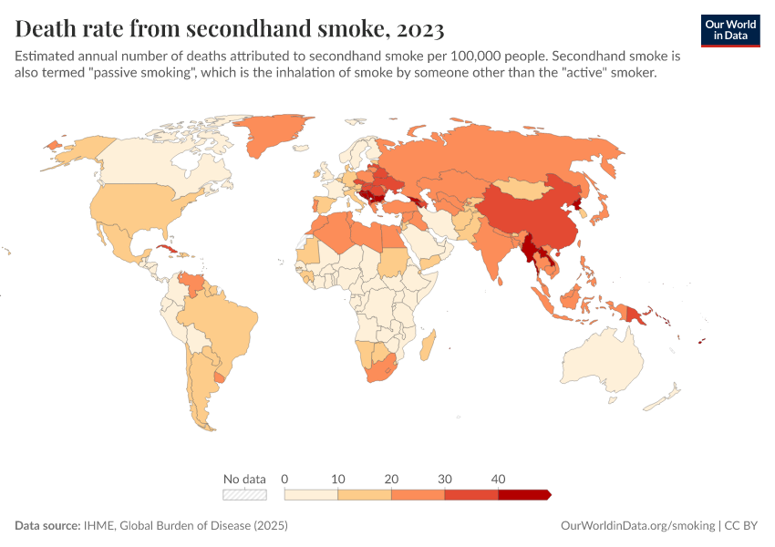 IHME, Global Burden of Disease (2025) – with major processing by Our World in Data. “Death rate from secondhand smoke” [dataset]. IHME, Global Burden of Disease, “Global Burden of Disease - Risk Factors - Deaths” [original data]. Retrieved March 12, 2026 from https://wip-stagingserver-resources.owid.pages.dev:8789/20260304-094028/grapher/death-rate-from-secondhand-smoke-gbd.html (archived on March 4, 2026).