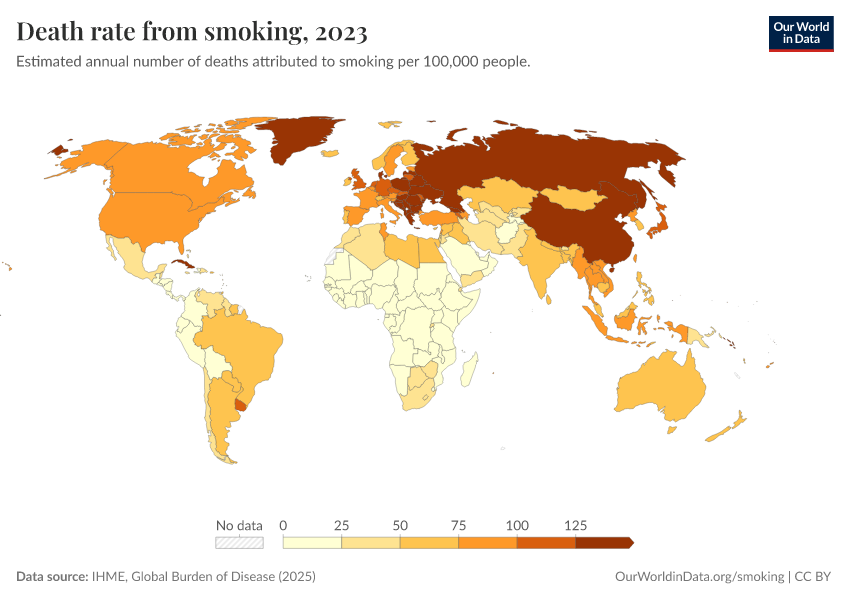 IHME, Global Burden of Disease (2025) – with major processing by Our World in Data. “Death rate from smoking” [dataset]. IHME, Global Burden of Disease, “Global Burden of Disease - Risk Factors - Deaths” [original data]. Retrieved March 12, 2026 from https://wip-stagingserver-resources.owid.pages.dev:8789/20260304-094028/grapher/death-rate-from-smoking.html (archived on March 4, 2026).