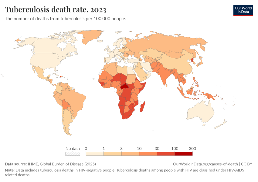 IHME, Global Burden of Disease (2025) – with major processing by Our World in Data. “Tuberculosis death rate” [dataset]. IHME, Global Burden of Disease, “Global Burden of Disease - Deaths” [original data]. Retrieved March 12, 2026 from https://wip-stagingserver-resources.owid.pages.dev:8789/20260304-094028/grapher/death-rate-from-tuberculosis-gbd.html (archived on March 4, 2026).