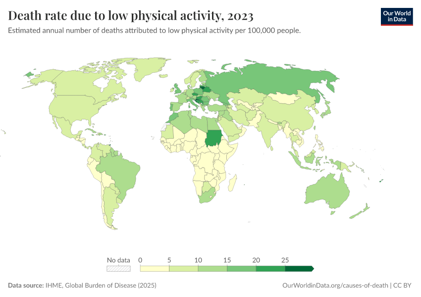 “Data Page: Death rate due to low physical activity”, part of the following publication: Esteban Ortiz-Ospina and Max Roser (2016) - “Global Health”. Data adapted from IHME, Global Burden of Disease. Retrieved from https://wip-stagingserver-resources.owid.pages.dev:8789/20260304-094028/grapher/death-rates-due-to-low-physical-activity-gbd.html [online resource] (archived on March 4, 2026).How to cite this data