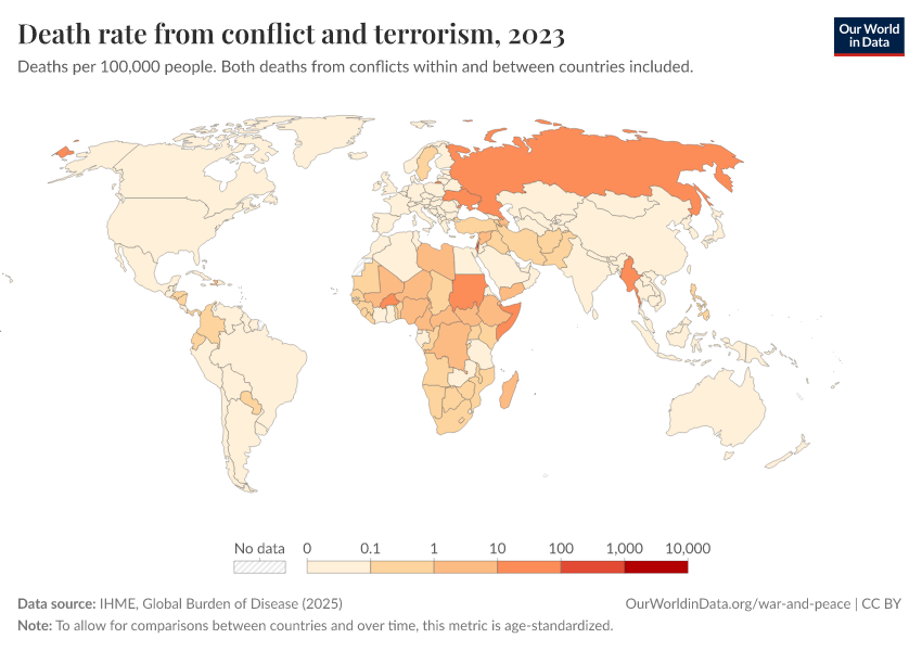 IHME, Global Burden of Disease (2025) – with major processing by Our World in Data. “Death rate from conflict and terrorism” [dataset]. IHME, Global Burden of Disease, “Global Burden of Disease - Deaths” [original data]. Retrieved March 12, 2026 from https://wip-stagingserver-resources.owid.pages.dev:8789/20260304-094028/grapher/death-rates-from-conflict-and-terrorism-gbd.html (archived on March 4, 2026).