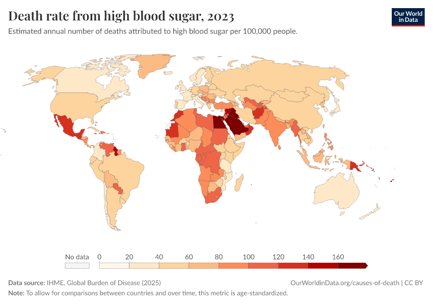 IHME, Global Burden of Disease (2025) – with major processing by Our World in Data. “Death rate from high blood sugar” [dataset]. IHME, Global Burden of Disease, “Global Burden of Disease - Risk Factors - Deaths” [original data]. Retrieved March 12, 2026 from https://wip-stagingserver-resources.owid.pages.dev:8789/20260304-094028/grapher/death-rates-from-high-blood-sugar.html (archived on March 4, 2026).