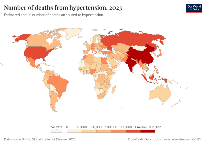 “Data Page: Number of deaths from hypertension”, part of the following publication: Esteban Ortiz-Ospina and Max Roser (2016) - “Global Health”. Data adapted from IHME, Global Burden of Disease. Retrieved from https://wip-stagingserver-resources.owid.pages.dev:8789/20260304-094028/grapher/deaths-due-to-high-blood-pressure.html [online resource] (archived on March 4, 2026).How to cite this data