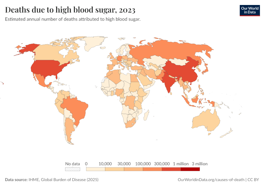 IHME, Global Burden of Disease (2025) – with major processing by Our World in Data. “Deaths due to high blood sugar” [dataset]. IHME, Global Burden of Disease, “Global Burden of Disease - Risk Factors - Deaths” [original data]. Retrieved March 12, 2026 from https://wip-stagingserver-resources.owid.pages.dev:8789/20260304-094028/grapher/deaths-due-to-high-blood-sugar.html (archived on March 4, 2026).