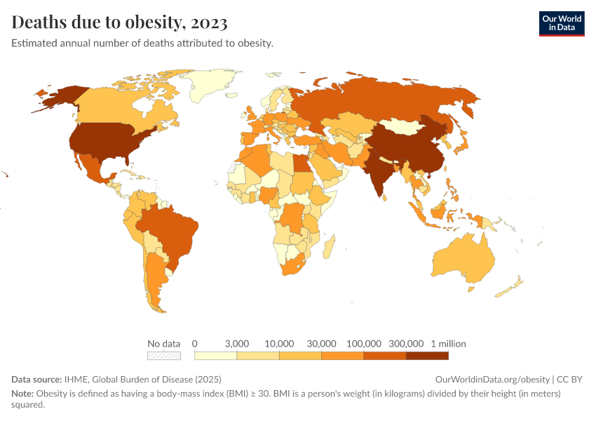 IHME, Global Burden of Disease (2025) – with major processing by Our World in Data. “Deaths due to obesity” [dataset]. IHME, Global Burden of Disease, “Global Burden of Disease - Risk Factors - Deaths” [original data]. Retrieved March 12, 2026 from https://wip-stagingserver-resources.owid.pages.dev:8789/20260304-094028/grapher/deaths-due-to-obesity.html (archived on March 4, 2026).