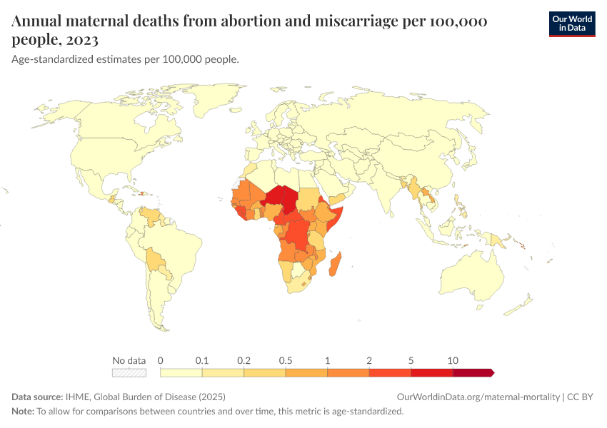 IHME, Global Burden of Disease (2025) – with major processing by Our World in Data. “Annual maternal deaths from abortion and miscarriage per 100,000 people” [dataset]. IHME, Global Burden of Disease, “Global Burden of Disease - Deaths” [original data]. Retrieved March 12, 2026 from https://wip-stagingserver-resources.owid.pages.dev:8789/20260304-094028/grapher/deaths-from-abortion-and-miscarriage-per-100000-people.html (archived on March 4, 2026).