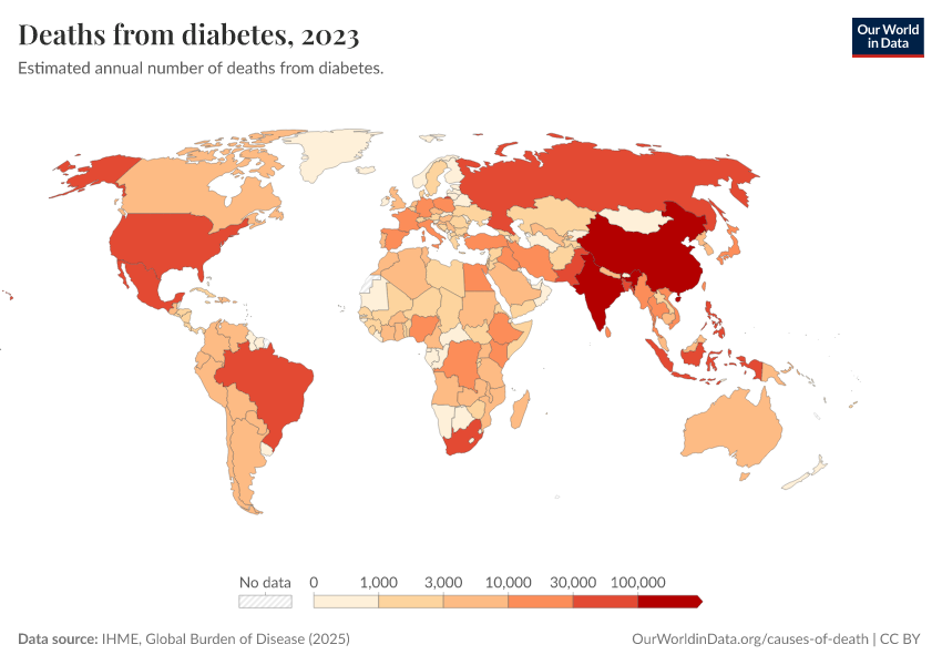 IHME, Global Burden of Disease (2025) – with major processing by Our World in Data. “Deaths from diabetes” [dataset]. IHME, Global Burden of Disease, “Global Burden of Disease - Deaths” [original data]. Retrieved March 12, 2026 from https://wip-stagingserver-resources.owid.pages.dev:8789/20260304-094028/grapher/deaths-from-diabetes.html (archived on March 4, 2026).