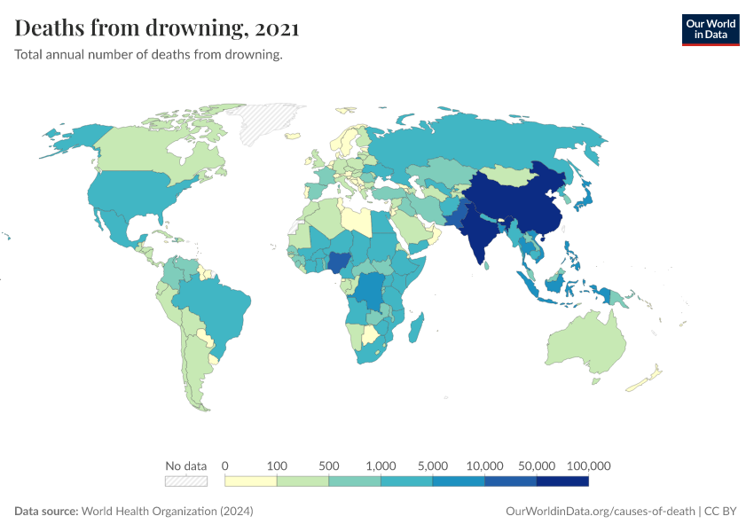 World Health Organization (2024) – with major processing by Our World in Data. “Deaths from drowning” [dataset]. World Health Organization, “Global Health Estimates” [original data]. Retrieved March 12, 2026 from https://wip-stagingserver-resources.owid.pages.dev:8789/20260304-094028/grapher/deaths-from-drowning-ghe.html (archived on March 4, 2026).