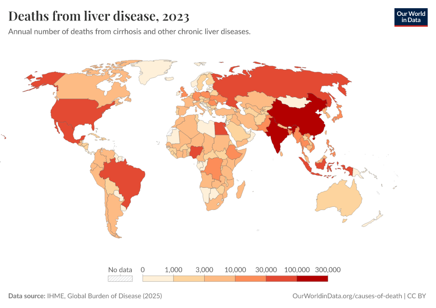 IHME, Global Burden of Disease (2025) – with major processing by Our World in Data. “Deaths from liver disease” [dataset]. IHME, Global Burden of Disease, “Global Burden of Disease - Deaths” [original data]. Retrieved March 12, 2026 from https://wip-stagingserver-resources.owid.pages.dev:8789/20260304-094028/grapher/deaths-from-liver-disease.html (archived on March 4, 2026).