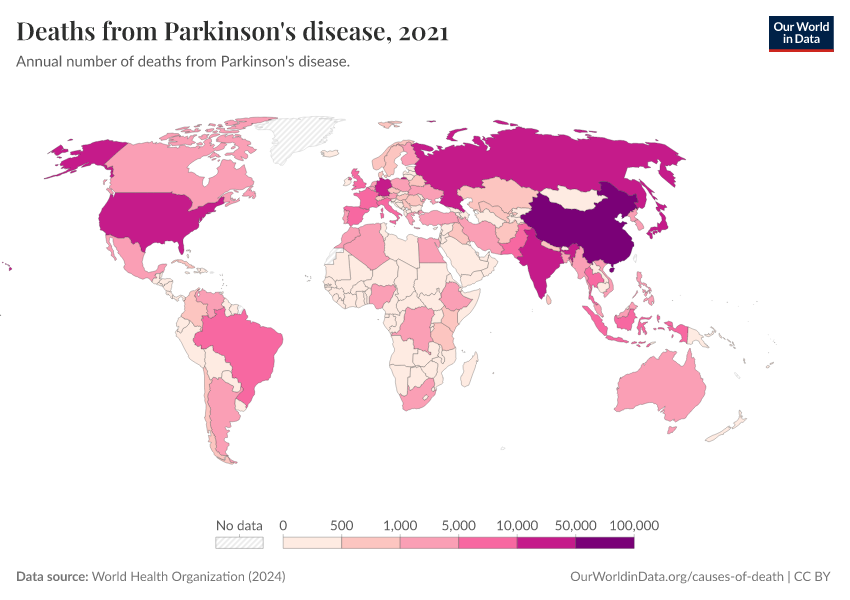 World Health Organization (2024) – with major processing by Our World in Data. “Deaths from Parkinson's disease” [dataset]. World Health Organization, “Global Health Estimates” [original data]. Retrieved March 12, 2026 from https://wip-stagingserver-resources.owid.pages.dev:8789/20260304-094028/grapher/deaths-from-parkinsons-disease-ghe.html (archived on March 4, 2026).