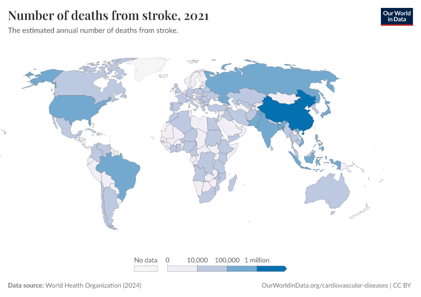World Health Organization (2024) – with major processing by Our World in Data. “Number of deaths from stroke” [dataset]. World Health Organization, “Global Health Estimates” [original data]. Retrieved March 12, 2026 from https://wip-stagingserver-resources.owid.pages.dev:8789/20260304-094028/grapher/deaths-from-strokes-ghe.html (archived on March 4, 2026).