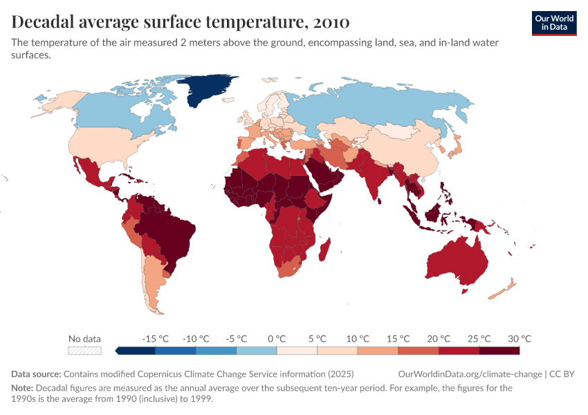 “Data Page: Decadal average surface temperature”, part of the following publication: Hannah Ritchie, Pablo Rosado, and Veronika Samborska (2024) - “Climate Change”. Data adapted from Contains modified Copernicus Climate Change Service information. Retrieved from https://wip-stagingserver-resources.owid.pages.dev:8789/20260304-094028/grapher/decadal-average-surface-temperature.html [online resource] (archived on March 4, 2026).How to cite this data