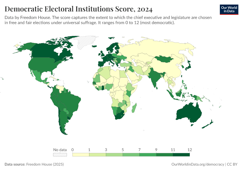 Freedom House (2025) – processed by Our World in Data. “Democratic Electoral Institutions Score” [dataset]. Freedom House, “Freedom in the World” [original data]. Retrieved March 12, 2026 from https://wip-stagingserver-resources.owid.pages.dev:8789/20260304-094028/grapher/democratic-electoral-institutions-fh.html (archived on March 4, 2026).
