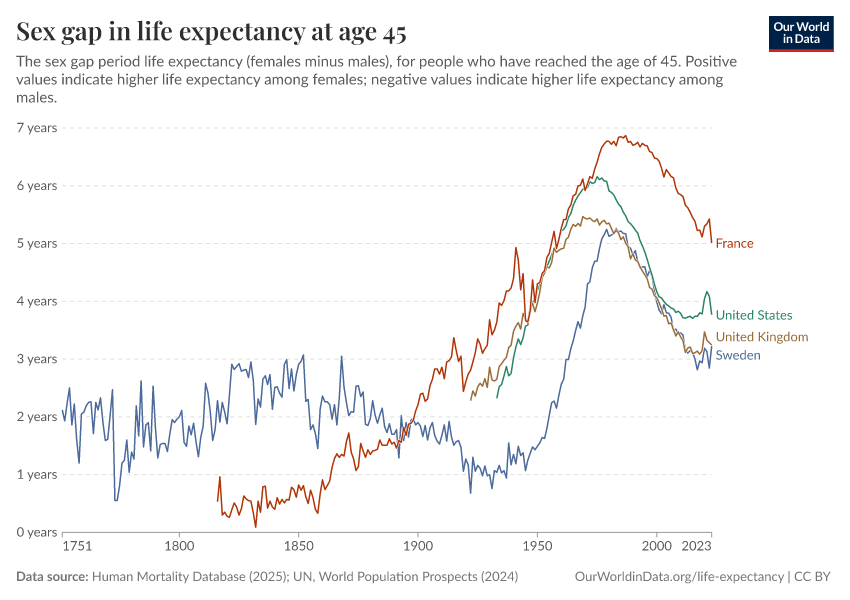 Human Mortality Database (2025); UN, World Population Prospects (2024) – with major processing by Our World in Data. “Life expectancy at 45 – HMD – female-male difference, period tables” [dataset]. Human Mortality Database, “Human Mortality Database”; United Nations, “World Population Prospects” [original data]. Retrieved March 12, 2026 from https://wip-stagingserver-resources.owid.pages.dev:8789/20260304-094028/grapher/difference-in-female-and-male-life-expectancy-at-age-45.html (archived on March 4, 2026).